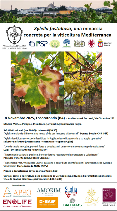 L’evento, moderato da Michele Peragine, Presidente dei Giornalisti Agroalimentari di Puglia, riunirà ricercatori, tecnici e operatori del comparto per affrontare il tema delle nuove sfide legate alla diffusione della Xylella fastidiosa e alla malattia di Pierce, con particolare attenzione alle strategie di prevenzione e alle prospettive future per la viticoltura regionale.